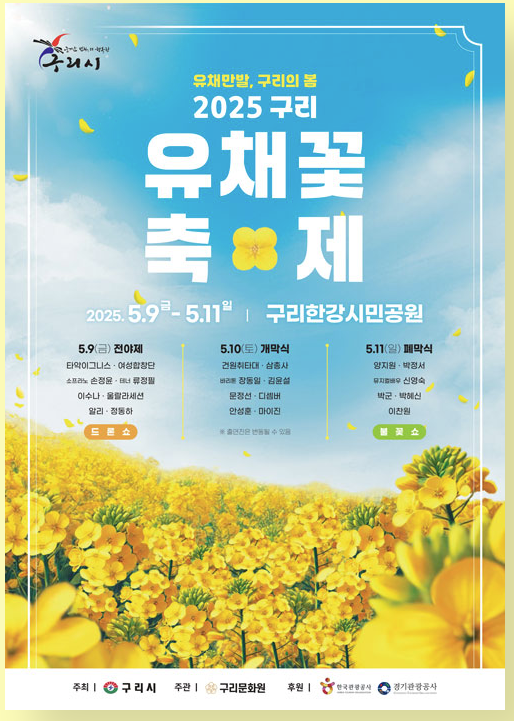 2025년 5월 9일부터 5월 11일까지 구리한강시민공원에서 개최되는 구리유채꽃 축제의 모든 정보를 총정리해드립니다.