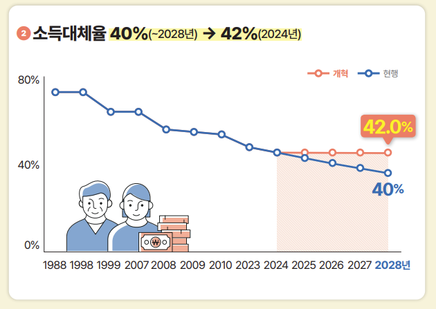 소득대체율이란 평균 소득에서 연금으로 돌려받는 비율을 말하는데, 현행 40%에서 42%로 올릴 예정이라고 합니다.