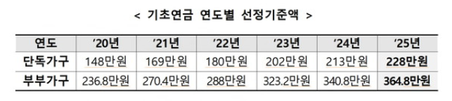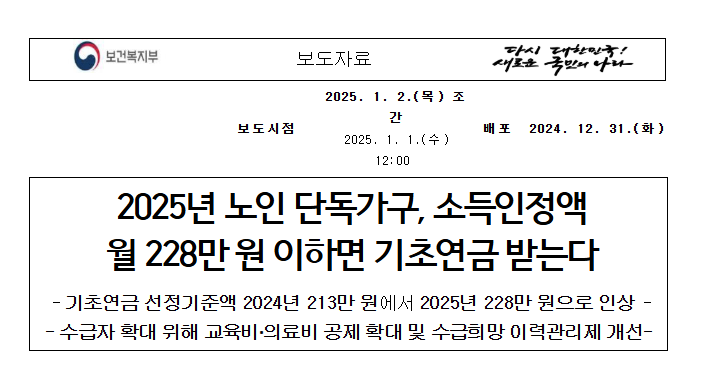 2025년부터 기초연금의 수급자격이 변경됩니다. 특히, 단독가구의 경우 소득인정액이 월 228만 원 이하일 때 기초연금을 받을 수 있습니다. 이는 2024년의 기준인 213만 원에서 인상된 수치입니다. 부부가구의 경우에는 소득인정액이 월 364만8000원 이하일 때 기초연금을 받을 수 있습니다.