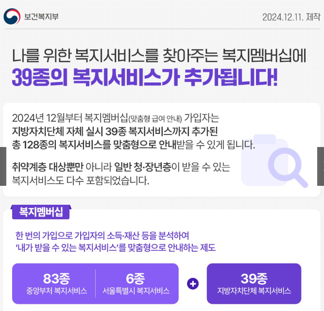 2025년에는 복지멤버십에 총 39종의 서비스가 추가됩니다. 이로 인해 기존의 89종에서 총 128종의 서비스가 제공되며, 더욱 다양한 혜택을 누릴 수 있게 됩니다. 새로운 서비스는 주로 주민등록지 기준으로 제공되며, 건강 관리, 생계 지원, 교육 지원 등 여러 분야에 걸쳐 있습니다.