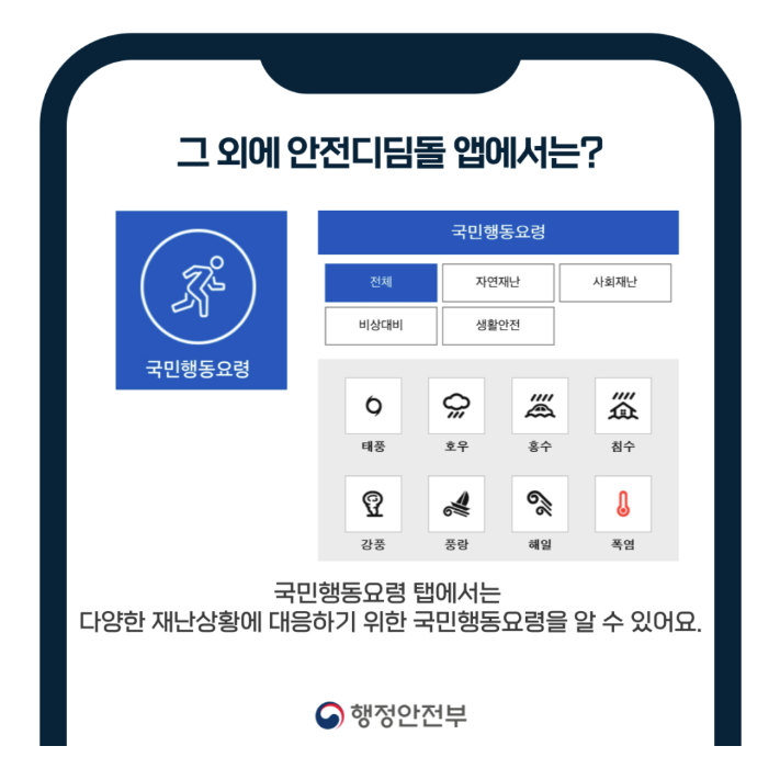 국민 행동 요령 : 재난 발생 시 어떻게 행동해야 하는지에 대한 가이드를 제공합니다.