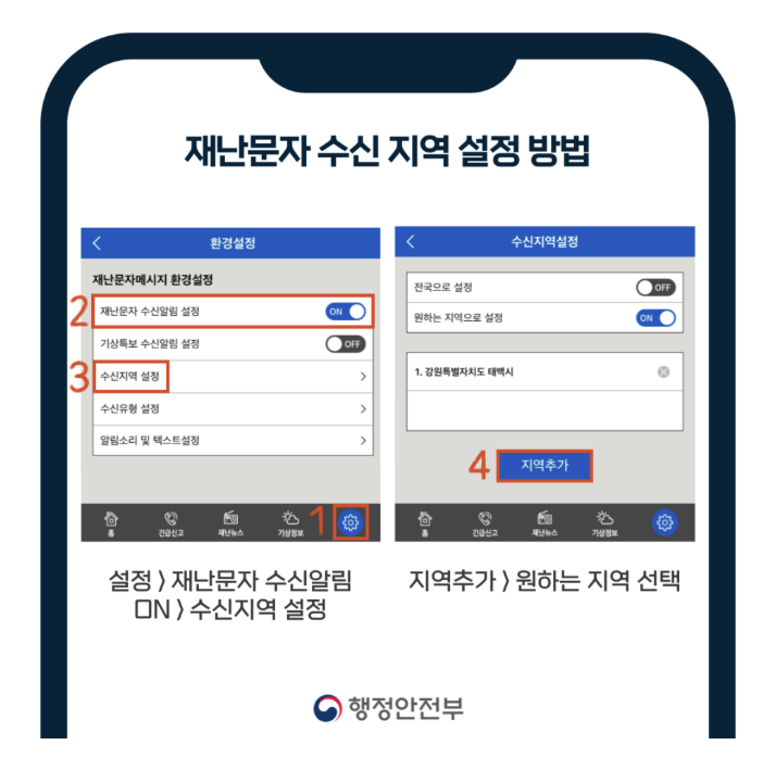 안전디딤돌 앱의 가장 중요한 기능 중 하나는 재난문자 알림입니다. 이를 설정하는 방법은 다음과 같습니다.