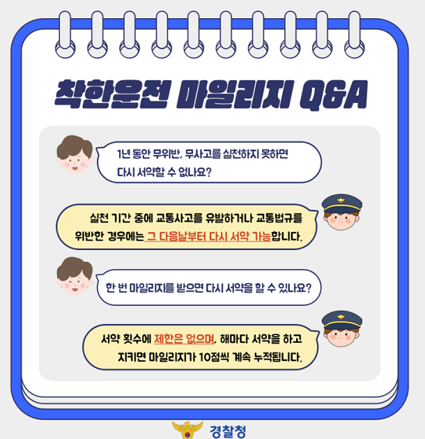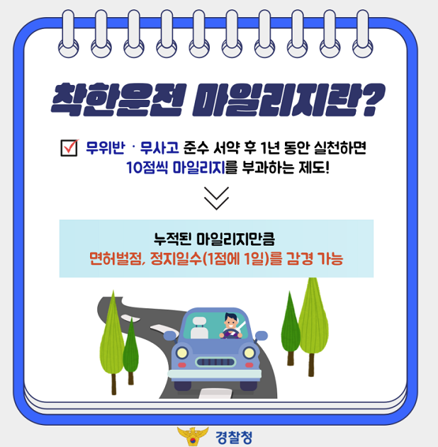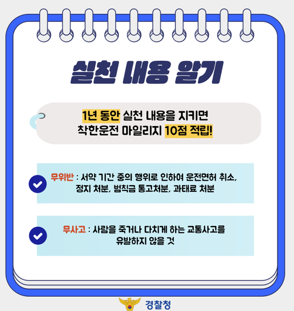 무위반, 무사고 준수 수약 후 1년 동안 실천하면 10점씩 마일리지를 부과하는 제도로