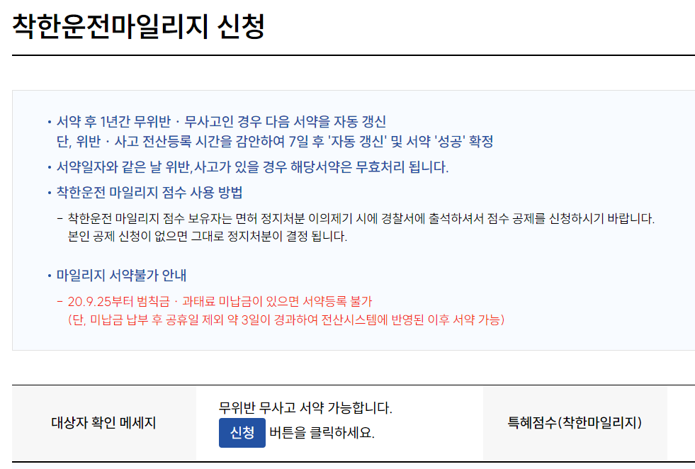착한운전 마일리지 적립 신청 후 신청화면에서 확인가능합니다.